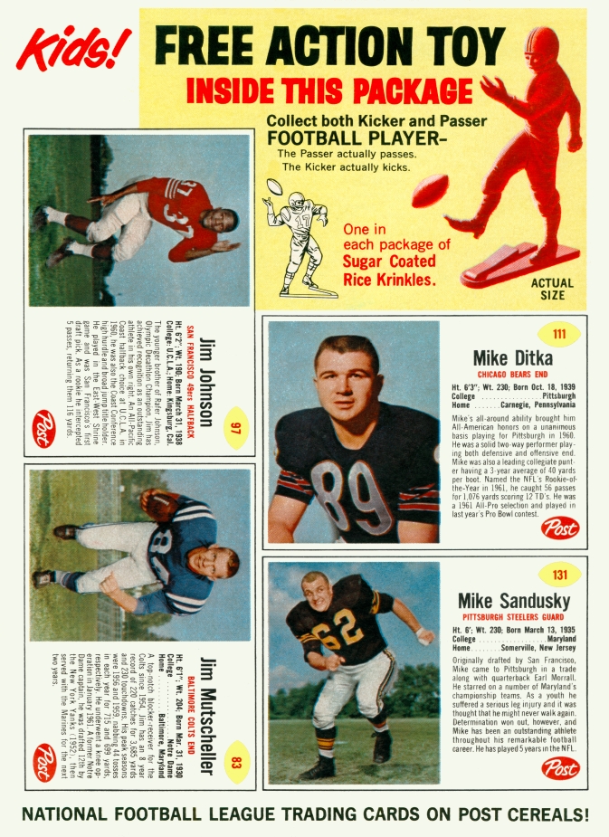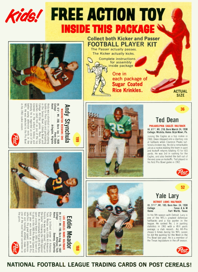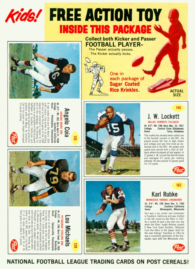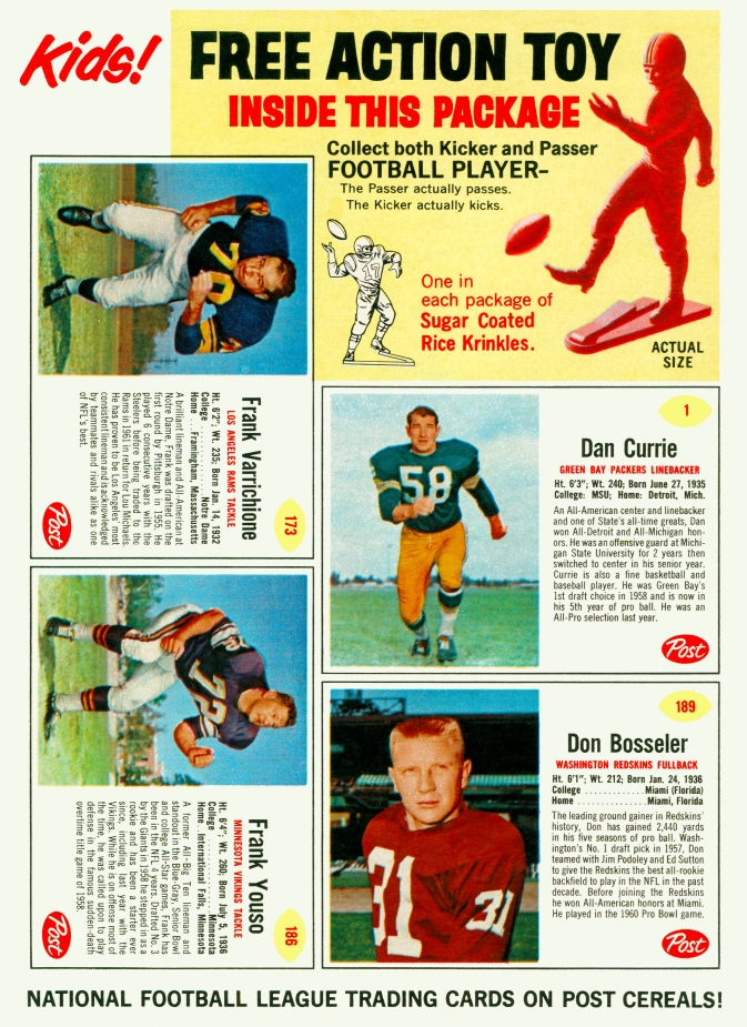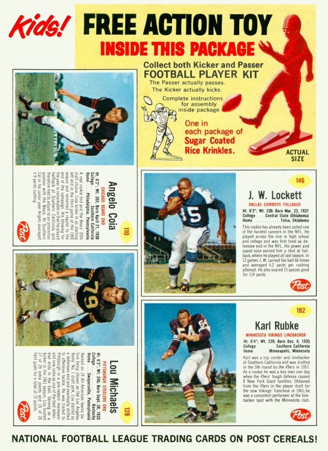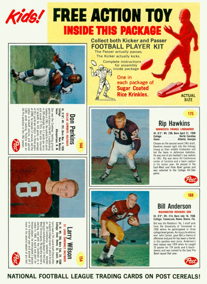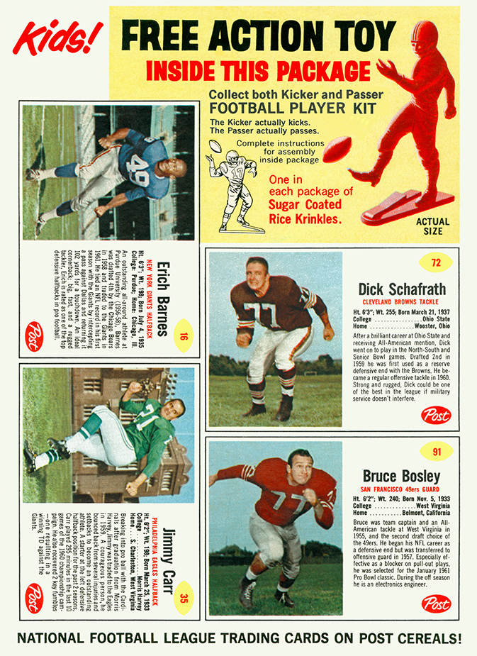 Rice Krinkles back panels feature advertising for a "FREE ACTION TOY INSIDE THIS PACKAGE." This is followed by "Collect both Kicker and Passer" and either "FOOTBALL PLAYER-" or "FOOTBALL PLAYER KIT". The information that there were two back panel styles was provided by Ken Marks and the reason for the back panel change is detailed in Dave Worley’s 2025 book, "Cereal & Gelatin: The 1955 Through 1964 Post Cereal and Jell-O Gelatin Sports Promotions (Volume One)". The book presents a General Foods/Post cereal memo dated June 19, 1962 that states that GF/Post’s legal department advised that the word "KIT" should be used on the back of all Rice Krinkles panels. On the initial print run "KIT" was printed on only one of the six different back panels with the other five printed with "PLAYER-", omitting the word "KIT". Also failing to print were the words "Complete instructions for assembly inside package". The memo specifies that the incorrect cartons would be used up but changes would be made to the rotogravure cylinders before printing more cartons.