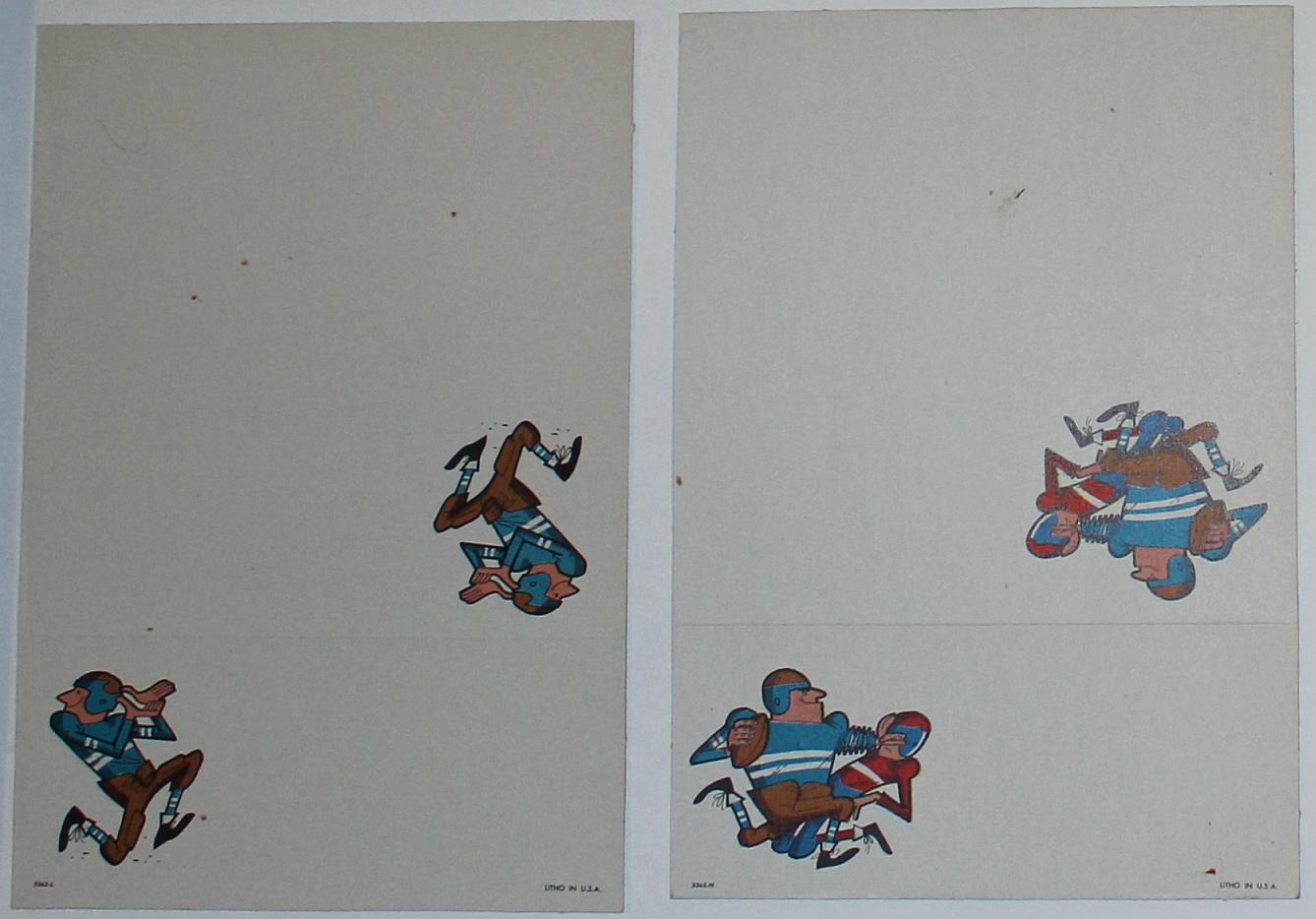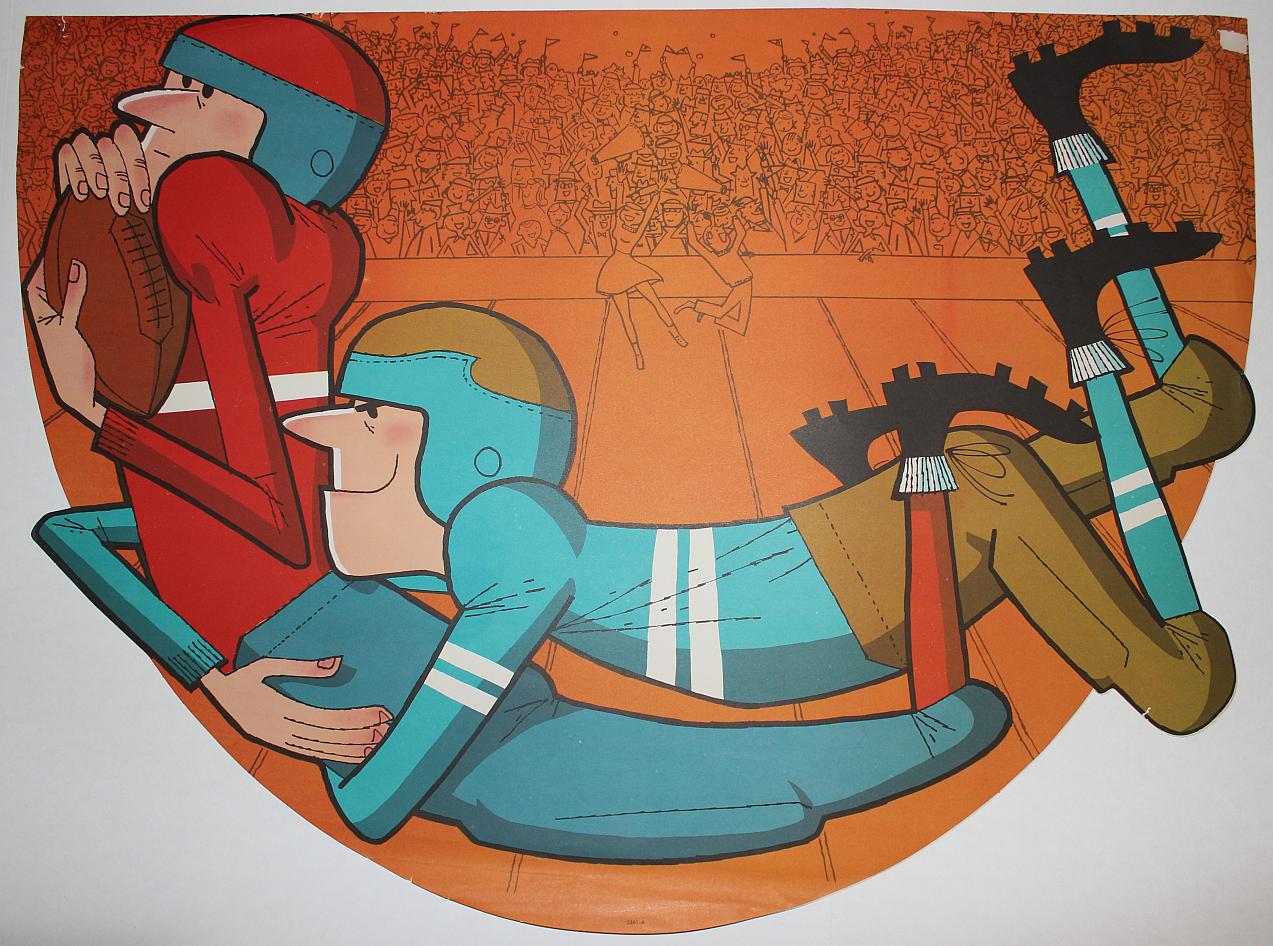 Stick displays were cardboard displays featuring football, referee and cheerleader characters. Stick displays were made as two separate pieces of cardboard placed back to back with the stick slid in between the sheets in a pre-stapled slot vertically in the middle of the sign. Please see the setup instructions image for some visual clarity. The nicest and most desirable collectible of the stick displays features oversized cards of Johnny Unitas, Paul Hornung and Bill Kilmer at the top of the sign. This centerpiece appears to have been delivered as a double sided sign that was also pre-stapled. There are at least two of these signs known to exist, one sign's characters facing left and the other sign's characters facing right. These two signs originally may have been one double sided sign that was taken apart. The setup instructions suggest that the stick displays could be located between a pyramid of cans, on top of a riser gondola or taped on a freezer.