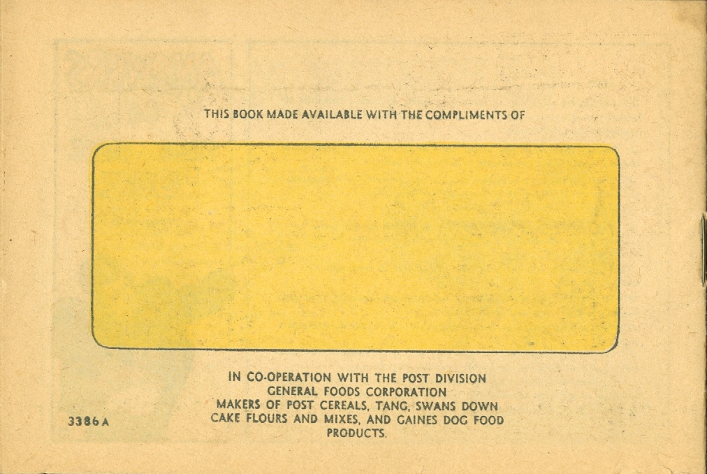 The back of each booklet shows the connection with the four products involved in the General Foods football promotion: Post cereals, Tang, Swans Down Cake Flours and Mixes and Gaines Dog Food (Gravy Train). Purchasers of these products could pick up booklets on the way out of the grocery store.